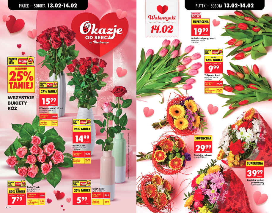 Walentynkowa paleta barw w Biedronce wygląda jak eksplozja w fabryce różowych flamingów, ale między różami po 5,99 zł za sztukę a tulipanami po 9,99 zł za 9 sztuk jest konkretna różnica nie tylko cenowa.