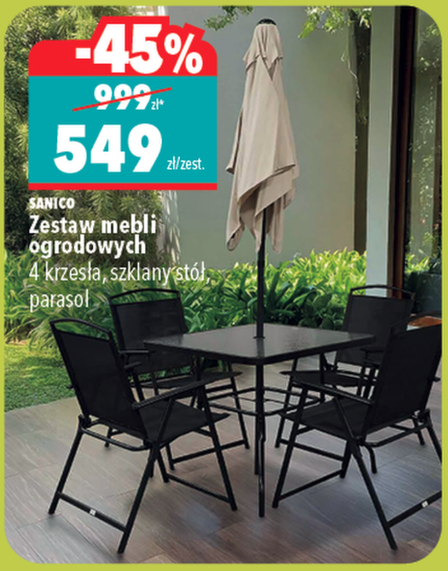 Druga propozycja to zestaw mebli ogrodowych SANICO — 4 krzesła, stół szklany i parasol za 549 zł zamiast 999 zł. Tu rabat to 45%. No i tu już mówimy o kompletnym wyposażeniu ogrodu. Stół szklany wygląda efektownie, ale warto się zastanowić, jak sprawdzi się w polskich warunkach — grad potrafi być bezlitosny. Sam bym przemyślał, czy nie lepiej postawić go pod zadaszeniem.