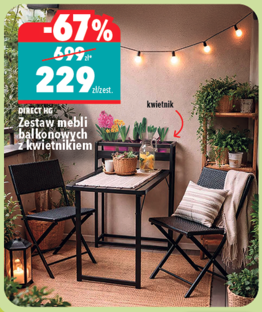 Pierwsza to zestaw mebli balkonowych z kwietnikiem DIRECT HG za 229 zł. Regularna cena to 699 zł, więc mamy tu rabat 67% — i szczerze mówiąc, to jeden z najgłębszych przecen w całej gazetce. Dla kogoś, kto urządza mały balkon w bloku, to może być strzał w dziesiątkę. Kwietnik w zestawie to fajny dodatek, bo nie trzeba osobno kombinować z donicami.