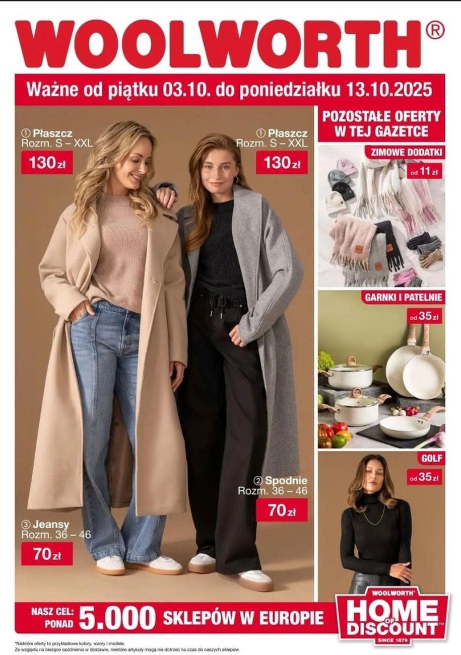Skoro już o płaszczach mowa, asortyment sklepu nie zawodzi. W gazetce znajdziemy zarówno lekki płaszcz pikowany za 130 zł, dostępny w kilku kolorach, jak i absolutny hit sezonu – płaszcz teddy, również za 130 zł. To dowód na to, że Woolworth śledzi trendy i udostępnia je w bardzo przystępnych cenach, stając w szranki z sieciówkami.