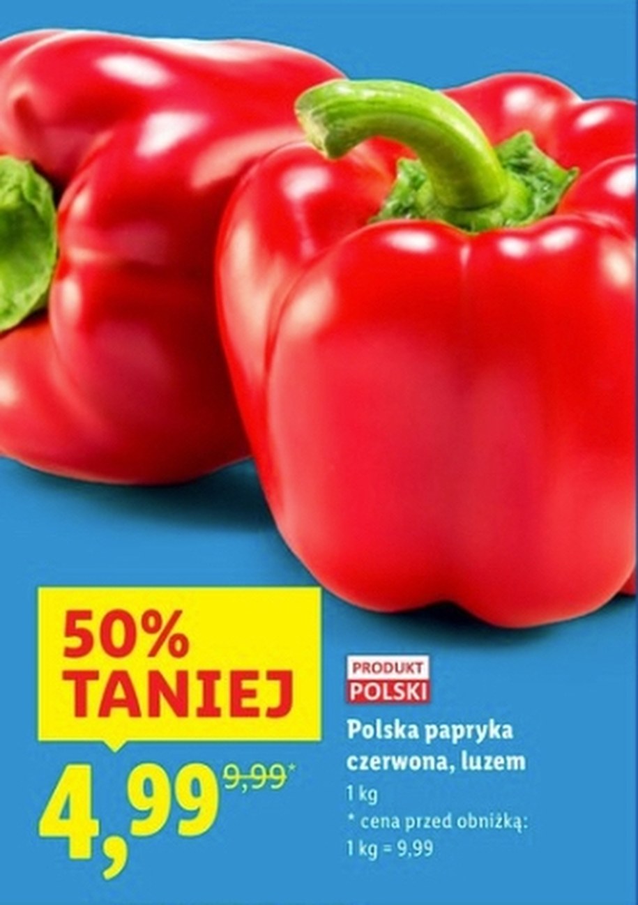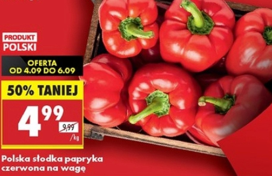 To, co obserwujemy na sklepowych półkach, to regularna wojna cenowa, a papryka jest jednym z jej głównych frontów. Wystarczy spojrzeć na oferty z początku września – zarówno w Lidlu, jak i w Biedronce, polska czerwona papryka pojawia się w niemal identycznej cenie 4,99 zł za kilogram, przeceniona z regularnej ceny blisko 10 zł. To nie przypadek. Czy zauważyłeś, jak często promocje w tych dwóch sklepach wyglądają jak lustrzane odbicie? Gdy jeden z gigantów obniża cenę kluczowego produktu, drugi niemal natychmiast odpowiada tym samym, aby nie stracić klientów, którzy są niezwykle wrażliwi na takie okazje. Dla nas to czysty zysk, ale dla całego rynku to potężny sygnał, który brutalnie ustala dolną granicę ceny.