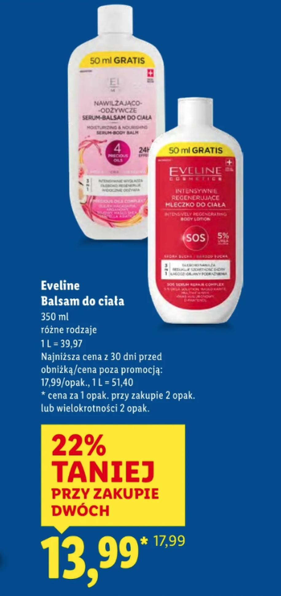 Eveline Balsam do ciała — 350 ml za 13,99 zł, też z rabatem 22% przy dwóch sztukach. Duże opakowanie, niska cena. Sprawdza się szczególnie zimą, kiedy skóra domaga się więcej nawilżenia.