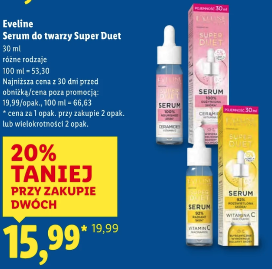 Eveline Serum Super Duet — 30 ml za 15,99 zł, przy zakupie dwóch sztuk 20% taniej. Serum łączy kwas hialuronowy z peptydami, co jak na tę cenę jest po prostu przyzwoitą ofertą.