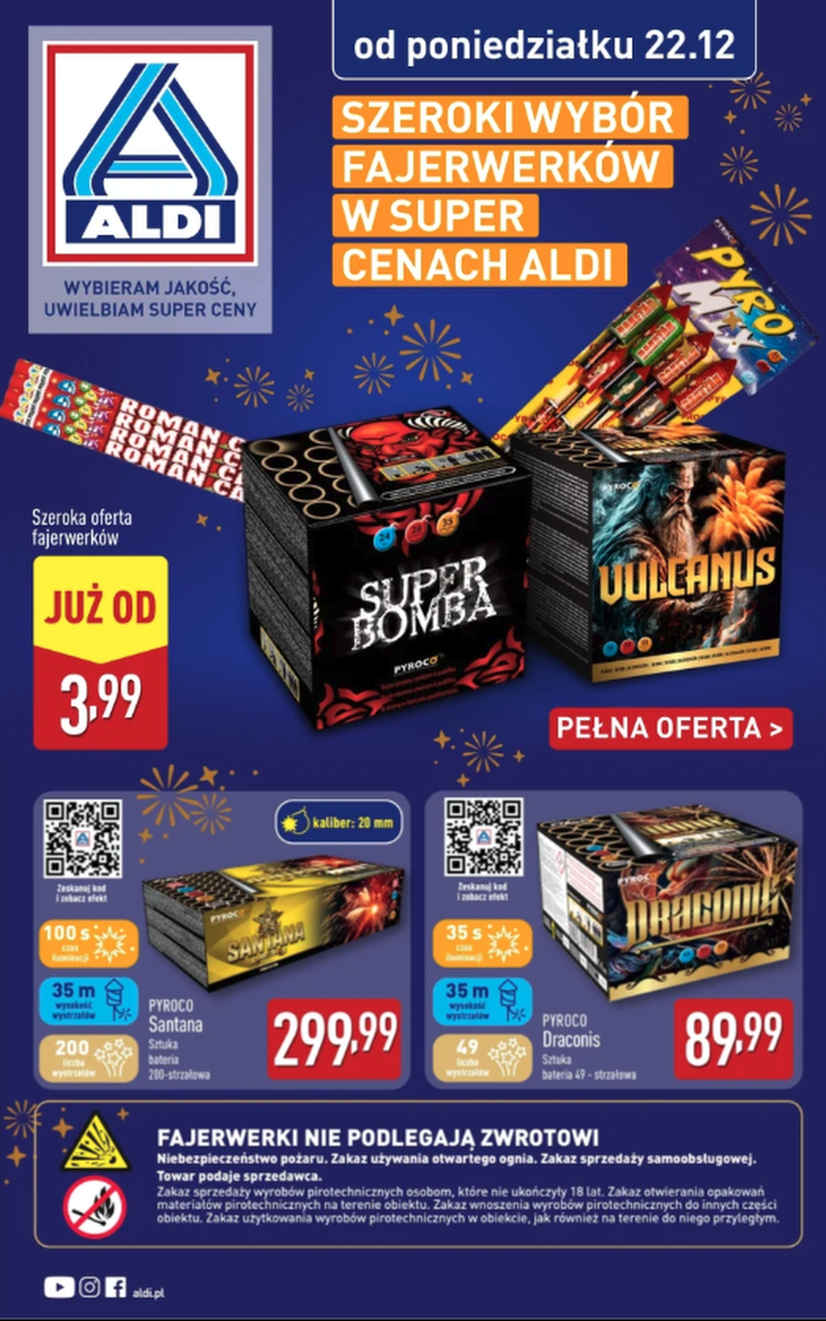 Sprzedaż fajerwerków w ALDI odbywa się sezonowo, przed sylwestrem. W sezonie 2025 oferta jest dostępna od 22 grudnia.