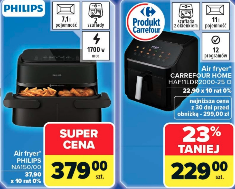 W aktualnej gazetce Carrefour na stronie z AGD kuchennym znalazłem dwa modele frytkownic beztłuszczowych. Pierwszy to Philips NA150 za 379 zł z możliwością rozłożenia na 10 rat 0%. Drugi — Carrefour Home HAF11LDR2000-25 O za 229 zł, obniżony z 299 zł, czyli 23% taniej. Oba dostępne od 13 kwietnia do 2 maja 2026. I szczerze mówiąc, na pierwszy rzut oka te dwa air fryery wyglądają jak z zupełnie różnych lig. Ale czy na pewno? Bo diabeł jak zwykle tkwi w szczegółach, a nie w logo na obudowie.