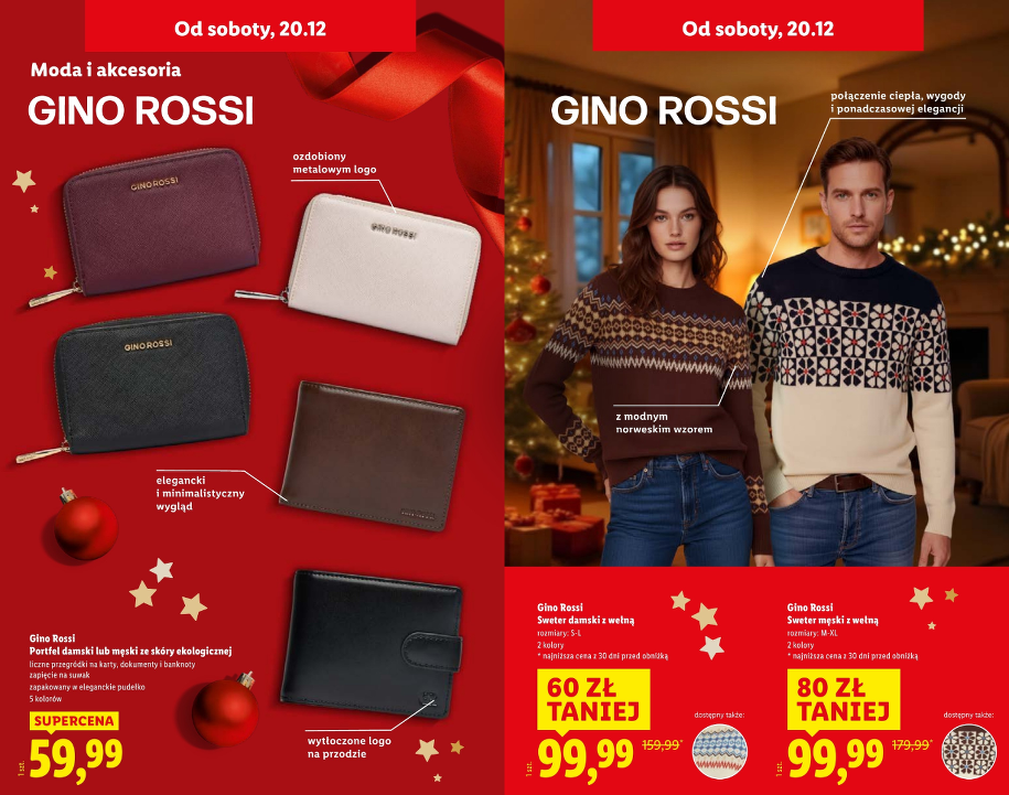 Równie interesująco prezentuje się oferta odzieżowa, która rzadziej kojarzona jest z tym brandem w kanałach dyskontowych. Od soboty 20.12 w sprzedaży pojawią się swetry damskie i męskie, reklamowane jako połączenie ciepła i ponadczasowej elegancji. Kluczowym elementem jest tu skład materiałowy – producent deklaruje zawartość wełny, choć dokładne proporcje warto sprawdzić bezpośrednio na metce w sklepie.