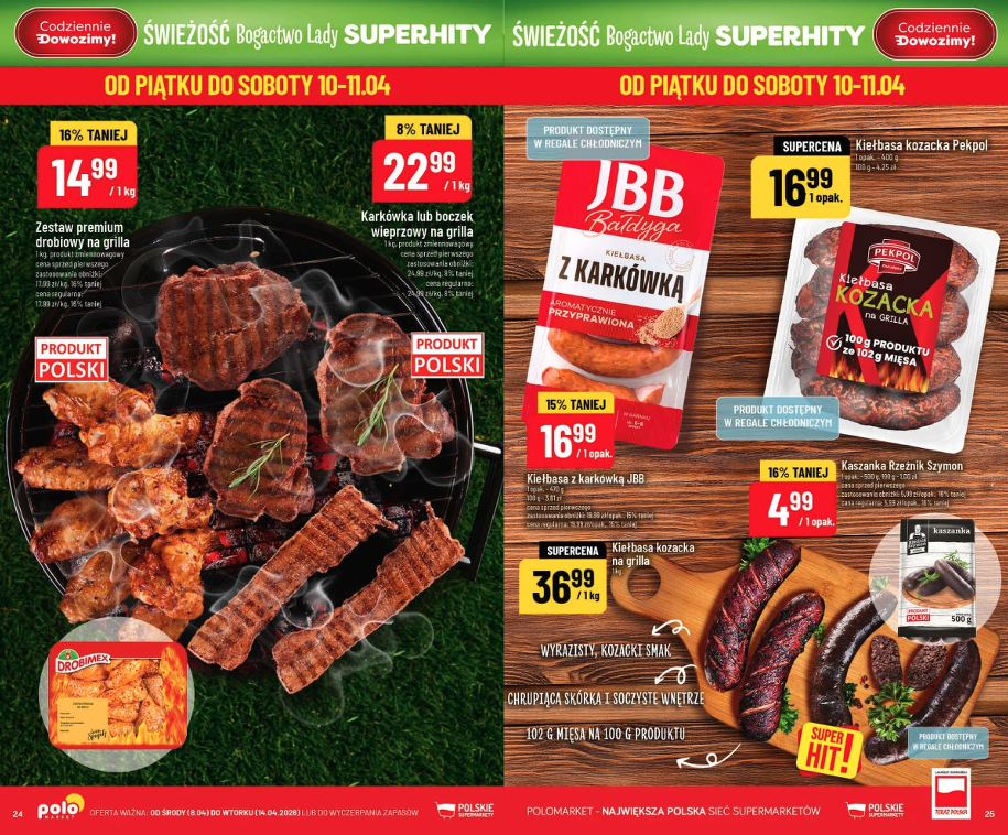 Oferta Polo Market na sezon grillowy trwa od 8 do 14 kwietnia 2026, część produktów dostępna jest tylko w weekend 10-11.04. Jeśli planuejcie pierwszy grill w tym roku — to dobry moment, żeby się zaopatrzyć w mięso na grilla i kiełbasę na grilla w atrakcyjnych cenach.
