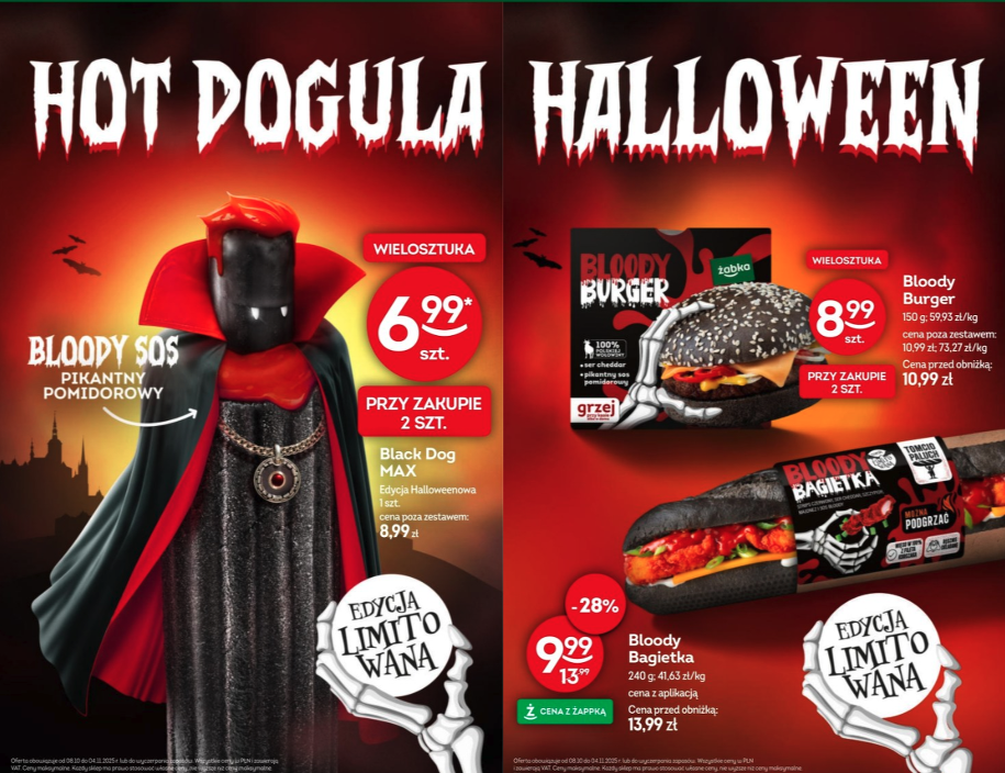 Halloween kojarzy się z dyniami, kostiumami, cukierkiem albo psikusem i horrorem. Żabka bawi się tymi symbolami wprost – stąd nazwy jak "Hot Dogula" (wampir Dracula), "Bloody" (krew), czarne bułki i czerwone sosy.