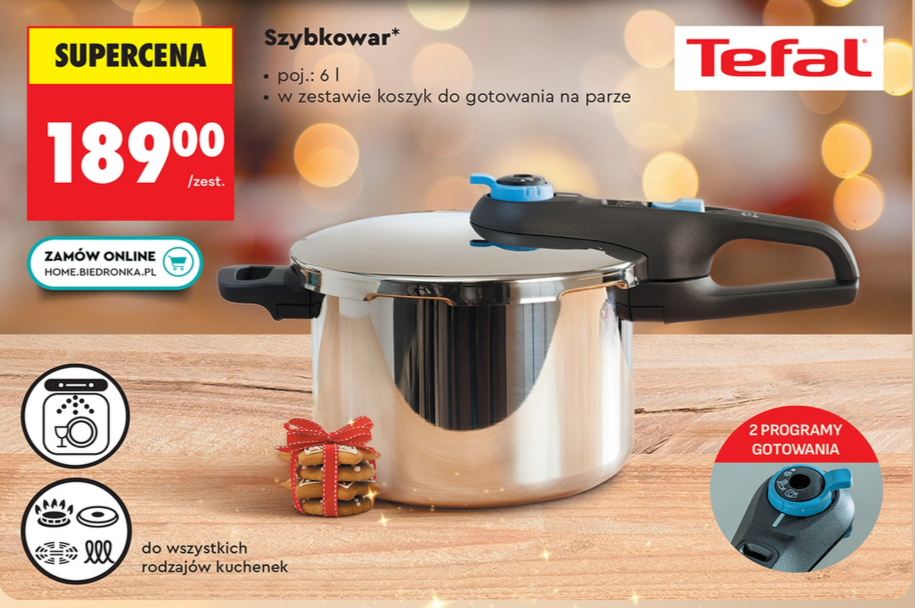 Przeglądając bieżące gazetki promocyjne, można trafić na sprzęt, który przyciąga uwagę nie tylko znanym logo, ale i relacją kosztów do oferowanych funkcji. Sieć Biedronka wprowadza do asortymentu szybkowar marki Tefal o pojemności 6 l, co stanowi rozmiar uznawany za najbardziej uniwersalny w domowych warunkach. Cena ustalona na poziomie 189.00 zł wygląda konkurencyjnie, zwłaszcza że w pudełku znajduje się kompletne wyposażenie niezbędne do rozpoczęcia pracy.