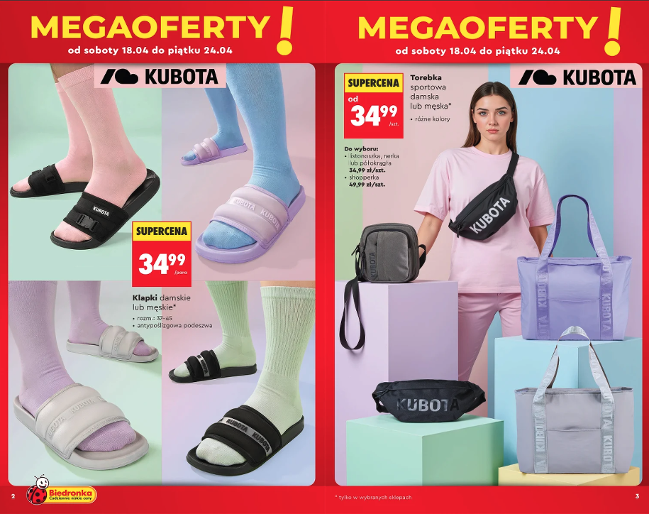 Na drugiej stronie gazetki wrzucili jeszcze torby Kubota. Listonoszka, nerka albo półtorakątka — każda po 34,99 zł. Większa shopperka idzie po 49,99 zł. Promocja tak samo od 18 do 24 kwietnia. Jak ktoś chce cały komplet na wakacje — torba plus klapki — wychodzi około 70 zł. Za ten budżet gdzie indziej dostaniesz co najwyżej samą torbę bez logo.