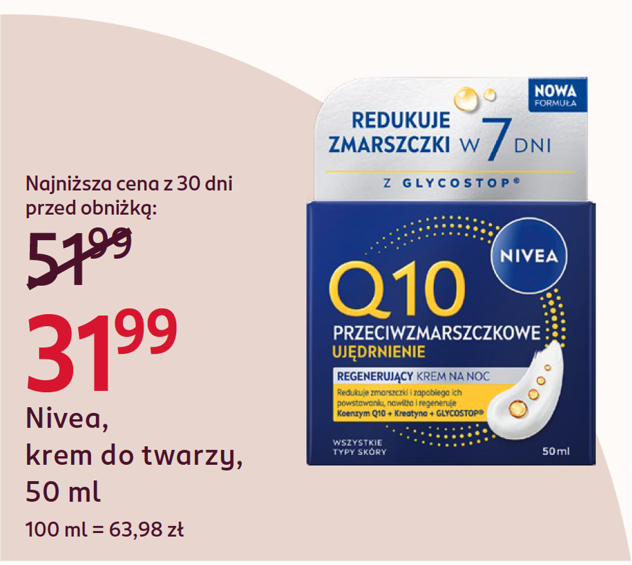 | Nivea krem do twarzy | 31,99 zł | 51,99 zł | −38% | 50 ml | 63,98 zł |