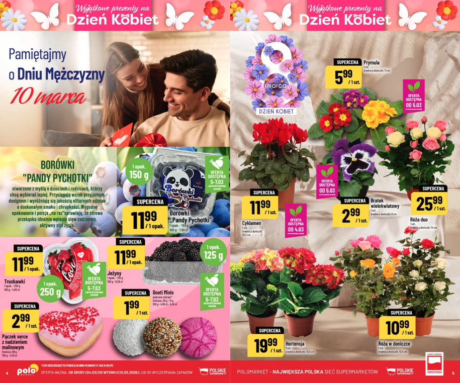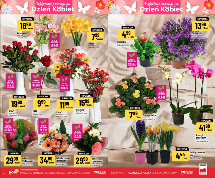 Gazetka promocyjna POLOmarket jest ważna od środy 4 marca do wtorku 10 marca 2026 roku lub do wyczerpania zapasów. Część kwiatów (m.in. róże, astromeria, bukiety) dostępna jest od 6 marca, a niektóre rośliny doniczkowe od 5 marca.