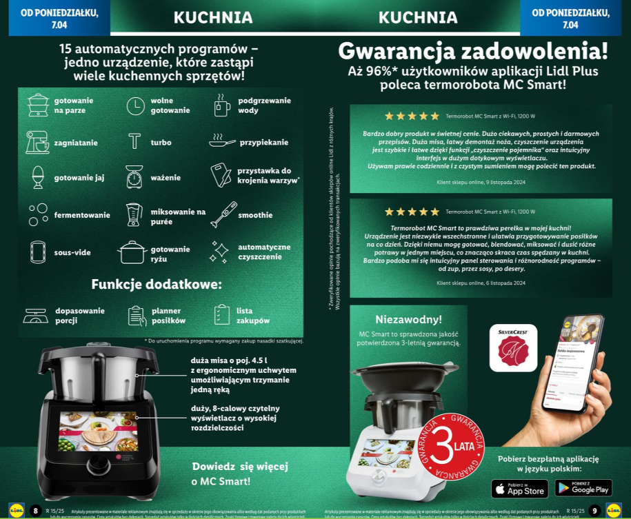 Gazetka Lidl poświęca sporo miejsca swojemu bohaterowi – MC Smart to coś więcej niż zwykły robot kuchenny. To sprzęt z 15 automatycznymi programami: gotowaniem na parze, ważeniem, przypiekaniem, blendowaniem, fermentowaniem czy funkcją sous-vide. I nie, to nie jest tylko dla kulinarnych geeków. Dzięki intuicyjnemu ekranowi dotykowemu o przekątnej 8 cali oraz wbudowanemu Wi-Fi, robot poprowadzi każdego – krok po kroku – przez setki przepisów.