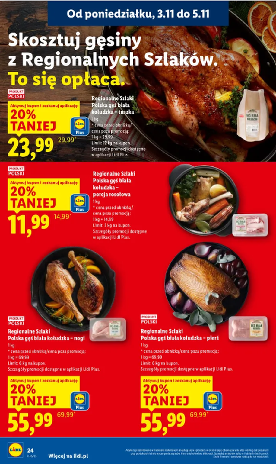 Widać, że sieci handlowe coraz śmielej sięgają po takie regionalne smaczki, próbując odtworzyć klimat dawnych świąt. Równolegle z rogalami, w ofercie Lidla można znaleźć również inne produkty nawiązujące do polskich tradycji kulinarnych. W ramach promocji na produkty z serii Regionalne Polskie Szlaki pojawia się na przykład polska gęś biała kołudzka, dostępna taniej z aplikacją Lidl Plus. To ciekawy trop dla kogoś, kto chciałby przygotować cały tradycyjny, listopadowy obiad.