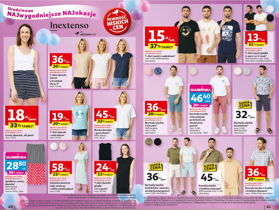 Nowa oferta Auchan to prawdziwy raj dla fanek i fanów prostych, ale stylowych rozwiązań. Na pierwszy ogień idą szorty damskie, all print za jedyne 18 zł/parę – nie tylko tanio, ale i wygodnie! Do tego idealnie pasują T-shirty damskie z nadrukiem za 19 zł, a jeśli ktoś woli coś bardziej klasycznego – świetną opcją będzie T-shirt damski, dekolt w kształcie litery V za 36 zł.