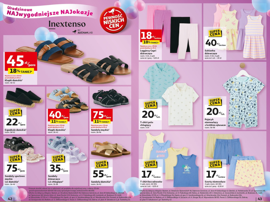Dzieci też mają swoje pięć minut w gazetce Auchan. Marka Inextenso przygotowała mnóstwo propozycji zarówno dla maluchów, jak i starszych dzieci. Zacznijmy od obuwia – wygodne klapki damskie w różnych kolorach kosztują tylko 40 zł/parę, ale uwaga – dla panów są też świetne sandały męskie za 75 zł oraz sandały sportowe męskie w tej samej cenie. Trochę zaskakuje cena, ale jakość wygląda na konkretną.