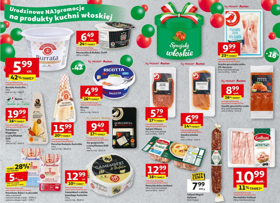Na pierwszej stronie włoskiej odsłony gazetki rządzą królowie sera. Za jedyne 5,99 zł kupimy Burratę Auricchio – delikatną, kremową, idealną do sałatki z pomidorami. Obok niej czeka Ricotta za 4,99 zł i aromatyczna Mozzarella di Bufala Cioffi za 6,49 zł. Jeśli ktoś lubi cięższe klimaty, to Gorgonzola DOP w cenie 9,49 zł może rozkochać nawet tych, którzy zazwyczaj omijają pleśniowe smaki.