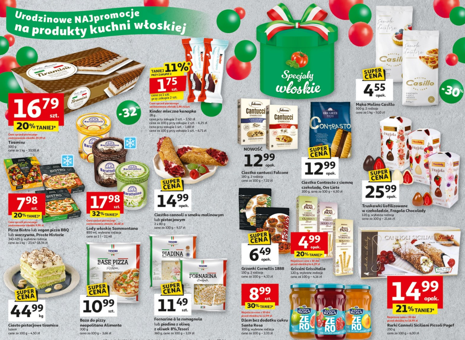 Dalej znajdziemy włoskie lody Barattolino w kilku wariantach smakowych za 17,98 zł – klasyka dla miłośników prawdziwego, kremowego chłodzenia. Na deser polecają się ciastka cannoli o smaku malinowym za 14,99 zł oraz tiramisu na wagę w cenie 44,99 zł/kg.