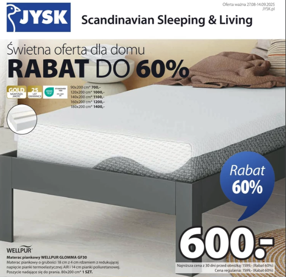 Muszę przyznać, że wybór materaca to dla mnie jedna z najtrudniejszych decyzji zakupowych. To inwestycja na lata, która bezpośrednio wpływa na jakość życia. Przecież to w łóżku spędzamy jedną trzecią doby. Dlatego tak bardzo ucieszyła mnie informacja o "Dniach Materaców" w Jysk. Rabaty sięgające 60% to nie byle co. To szansa na zakup modelu z wyższej półki w cenie, która nie zwala z nóg. Przeglądając ofertę, od razu wpadł mi w oko materac piankowy WELLPUR GLOMMA GF30. Obniżka z 1599 zł na 600 zł robi wrażenie. A co dostajemy w tej cenie? Rdzeń z pianki termoelastycznej AIR, która redukuje napięcie i dopasowuje się do ciała, a do tego poszycie, które można bez problemu wyprać. To właśnie takie detale świadczą o jakości. Uważam, że to jedna z tych okazji, obok których nie można przejść obojętnie, jeśli szukacie porządnego materaca. Kategoria JYSK - materace naprawdę błyszczy w tej gazetce.
