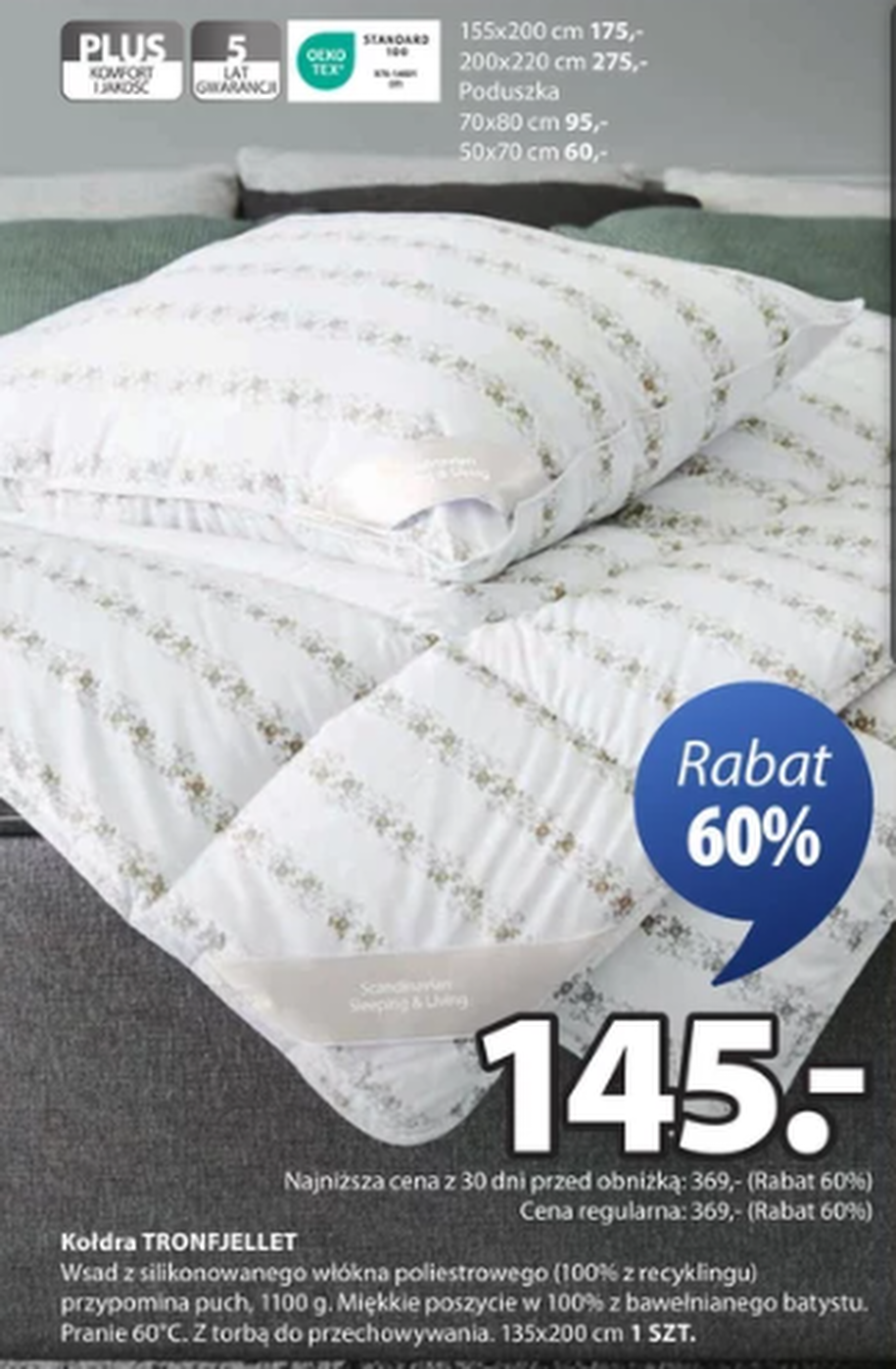 - Kołdra TRONFJELLET – produkt z najwyższej linii GOLD, przeceniony o 60% (ze 369 zł na 145 zł). Wypełnienie z recyklingowanych włókien poliestrowych i poszycie z delikatnej bawełny o batystowym splocie to obietnica lekkości i idealnej termoregulacji.