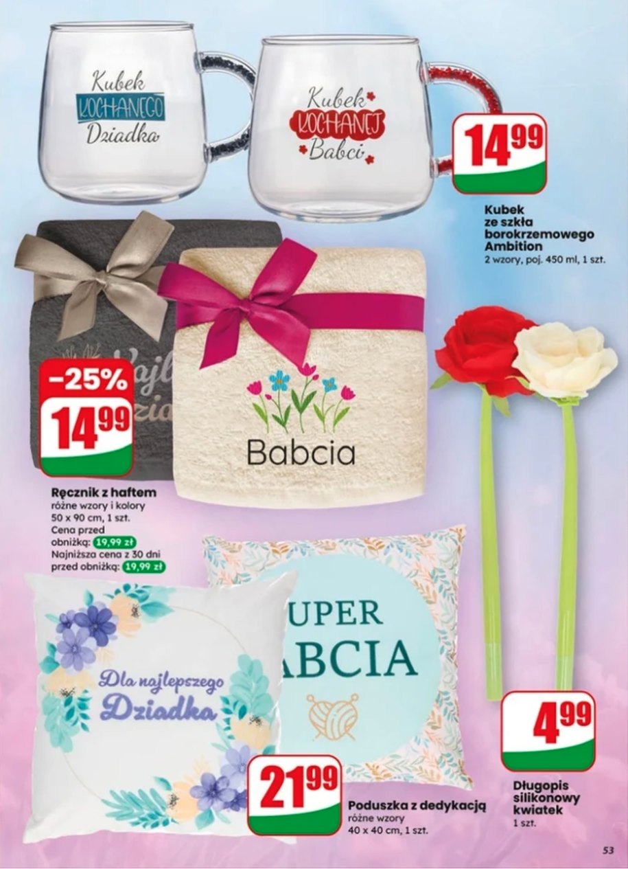 Poduszka z dedykacją "Dla najlepszego Dziadka" lub "Super Babcia" (40 x 40 cm) za 21,99 zł to najtańsza opcja na rynku. Dla porównania – podobne poduszki w sklepach internetowych kosztują 35-40 zł. Różne wzory, miękki materiał. Jeśli chcesz sprawdzić pełną ofertę, zajrzyj do gazetki promocyjnej Dino – znajdziesz tam wszystkie dostępne promocje na prezenty.