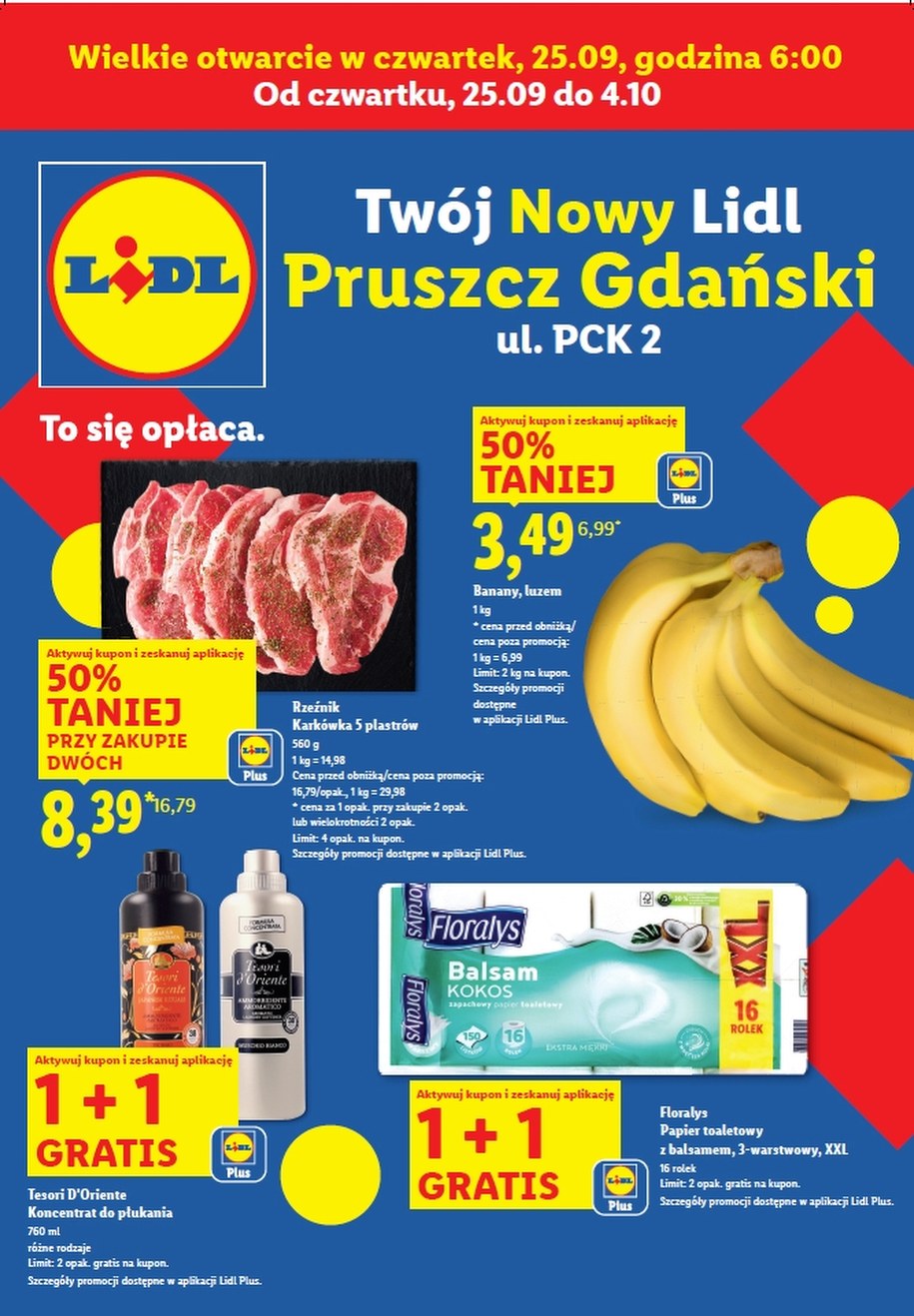Na otwarcie nowego sklepu Lidl w Pruszczu Gdańskim zaplanowano zestaw promocji, które mają przyciągnąć tłum. I wygląda na to, że się uda. Banany po 3,49 zł za kilogram (zamiast 6,99 zł) — oczywiście z kuponem w aplikacji Lidl Plus. Płyny do płukania Tesori D'Oriente w promocji 1+1, podobnie jak papier toaletowy Floralys XXL. Ceny schodzą w dół, ale tylko dla tych, którzy wiedzą, gdzie kliknąć.