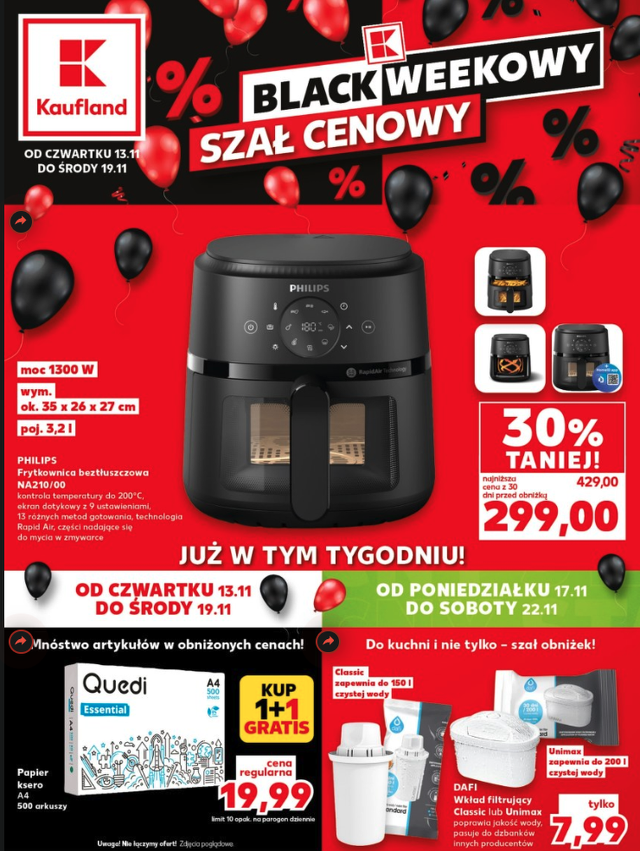 Chociaż pięć wymienionych produktów to absolutny top, gazetki promocyjne Kauflandu kryją znacznie więcej ciekawych ofert. Warto zwrócić uwagę na szeroki wybór elektroniki i AGD, gdzie zniżki często sięgają kilkudziesięciu procent. W promocji znajdziemy między innymi frytkownicę beztłuszczową Philips za 299 zł (taniej o 30%) czy maszynkę do mielenia mięsa Bosch przecenioną o 44% na 249 zł.
