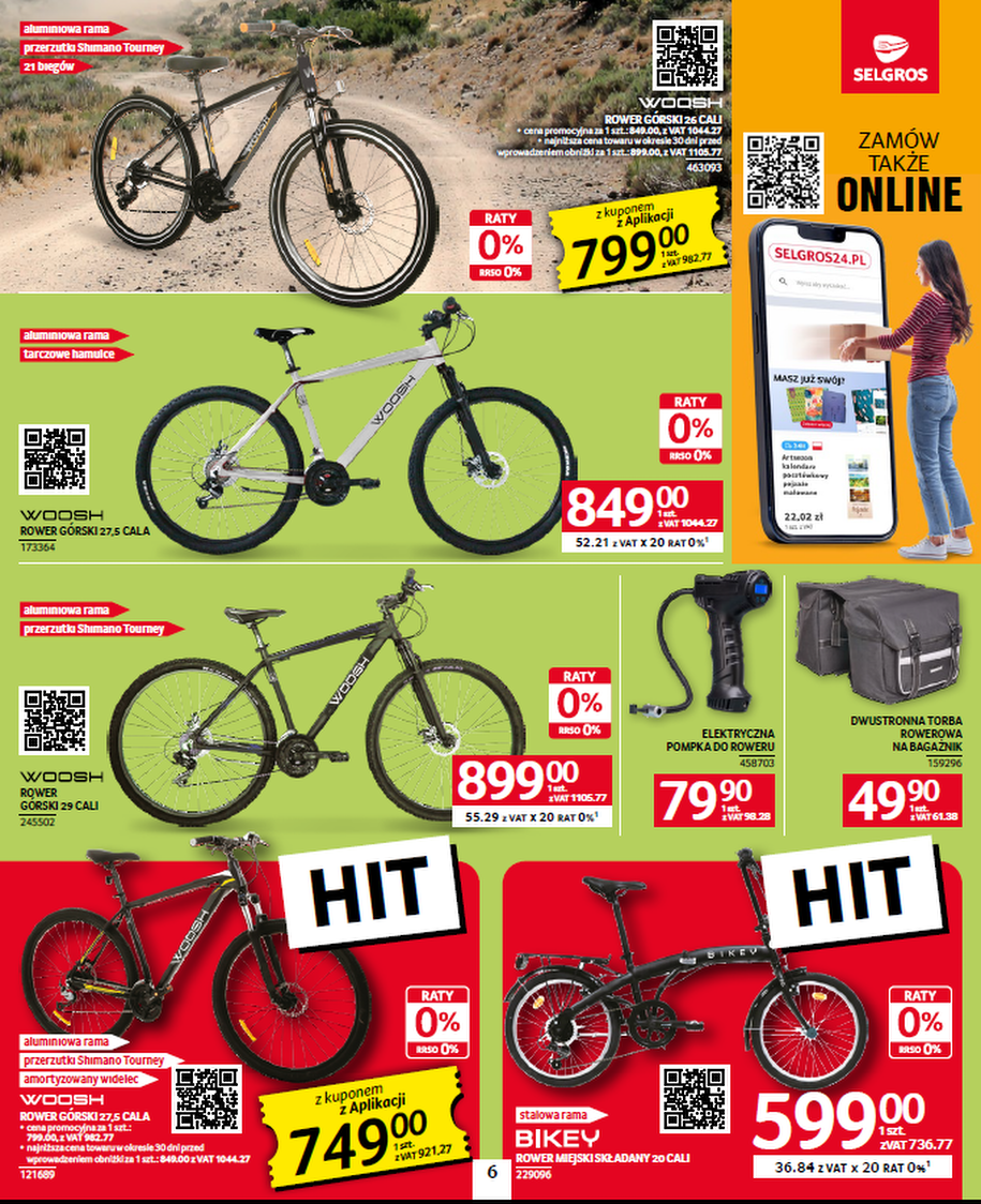Aha – ważna rzecz: akcesoria rowerowe w promocji – drugi produkt –50%. To dobry moment, żeby zgarnąć porządny kask, światła, pompkę, a może i koszyk piknikowy (bo czemu nie?). Wszystko w jednym miejscu, bez biegania po sklepach.