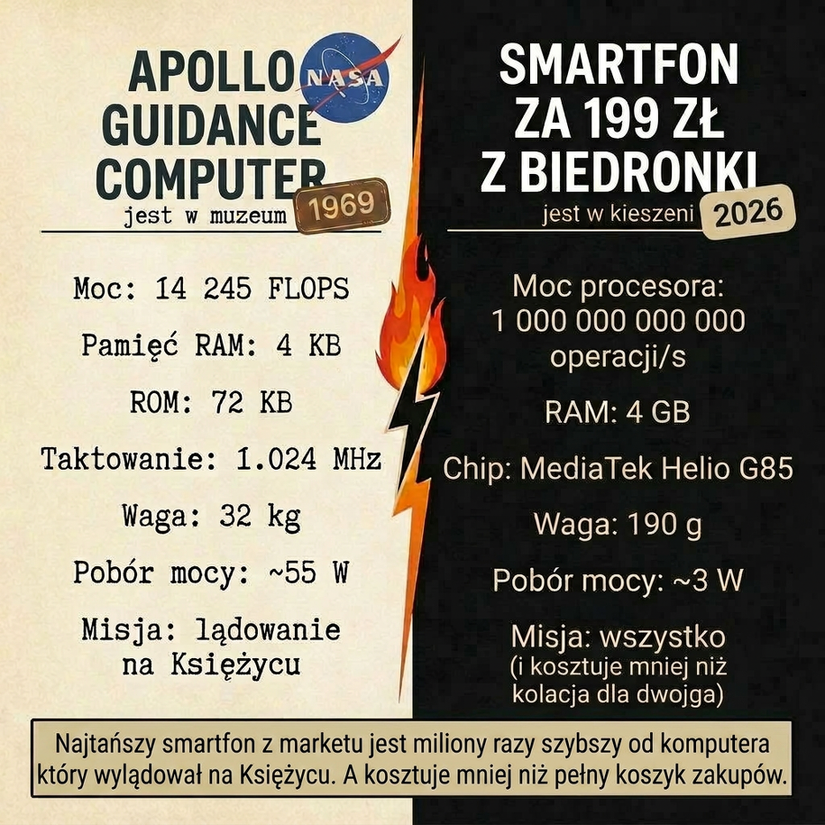 Następnym razem jak ktoś powie że „tanie telefony do niczego" — pokażcie mu tę infografikę. Bo ten najtańszy smartfon z promocji jest dosłownie miliony razy potężniejszy od maszyny która zawiozła człowieka na Księżyc. A kosztuje tyle co trzy pizze z dostawą.