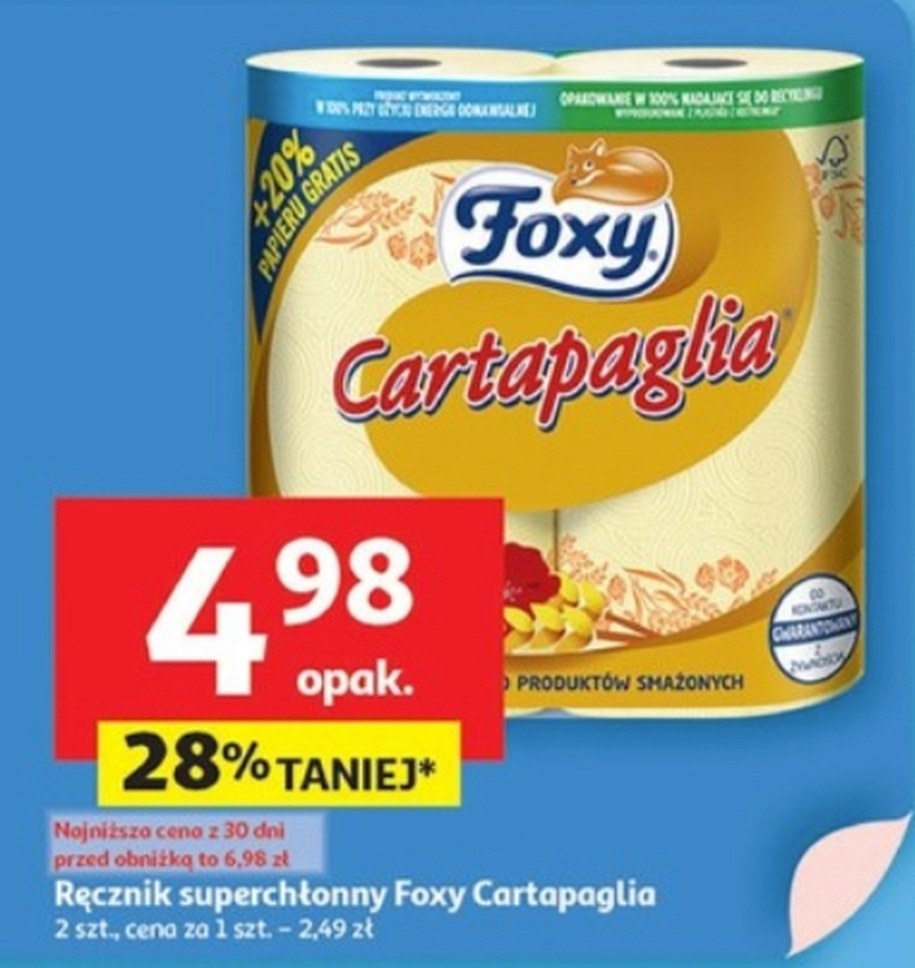 Papierowe ręczniki to absolutny must-have w każdym domu, prawda? W ofercie Auchan znajdziesz je w rewelacyjnej promocji 2+1 gratis, gdzie przy zakupie trzech produktów, najtańszy otrzymasz za darmo. Możesz dowolnie mieszać różne marki, takie jak Regina Blitz, Foxy Tornado czy produkty marki własnej Auchan. Osobno wyróżnia się też superchłonny ręcznik Foxy Cartapaglia, którego dwupak kosztuje 4,98 zł.