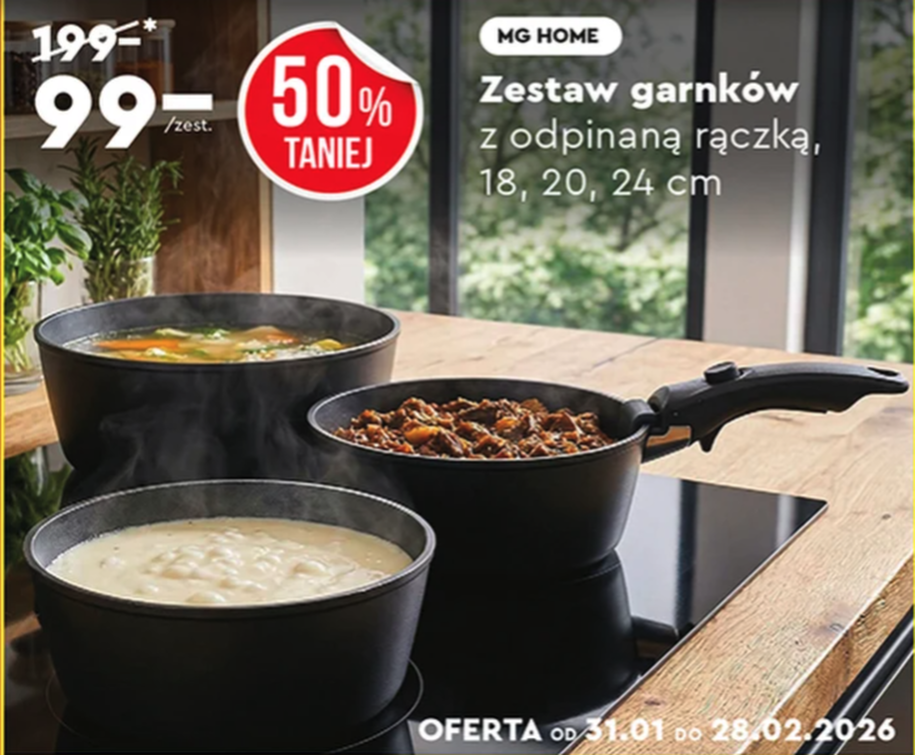 Biedronka od 31 stycznia do 28 lutego 2026 sprzedaje zestaw trzech garnków MG HOME za 99 zł. Normalna cena? 199 złotych, więc matematyka wygląda kusząco. W zestawie dostajesz garnki o średnicach 18, 20 i 24 cm, wszystkie z odpinaną rączką (co producent reklamuje jako zaletę przy przechowywaniu).
