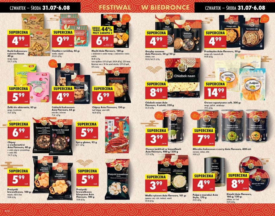 Nie samym obiadem człowiek żyje. Tym bardziej jeśli lubi słodkości albo przekąski między posiłkami. Tutaj Biedronka też ma coś do zaoferowania. Mochi – 6,99 zł. Delikatne, sprężyste, trochę nietypowe, ale wciągające. Ciastka z wróżbą – 4,99 zł. Dla jednych zabawne, dla innych kicz – jak kto woli. Ale na stole wyglądają świetnie. Są też rurki kokosowe (4,99 zł) i cukierki Asia Flavours (4,99 zł) – małe, słodkie, idealne do herbaty.