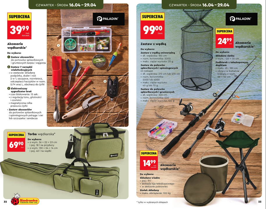 Szczerze? Dla początkujacego wędkarza albo kogoś kto łowi rekreacyjnie kilka razy w sezonie — jak najbardziej tak. Zestaw wędkarski za 99 zł nie zastąpi sprzętu za tysiąc złotych, ale na spokojne łowienie na spławik czy lekki spinning w pełni wystarczy. Paladin to marka która regularnie pojawia się w Biedronce i Lidlu — nie jest to żaden no-name. Całą aktualną ofertę wędkarską z cenami możecie sprawdzić w gazetce promocyjnej Biedronki. Pamiętajcie tylko, że oferta trwa od 16 do 29 kwietnia 2026, więc nie ma co zwlekać — w Biedronce tego typu sprzęt wędkarski znika z półek w kilka dni.