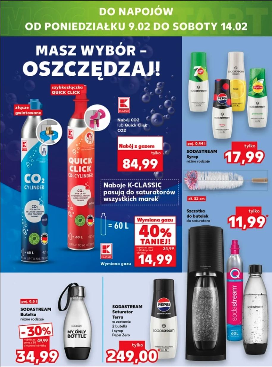 Kaufland oferuje wymianę naboju za 14,99 zł w promocji (normalnie 24,99 zł). W innych sklepach ceny wahają się od 25 do 35 zł. Warto pilnować promocji, bo to największy koszt użytkowania saturatora.