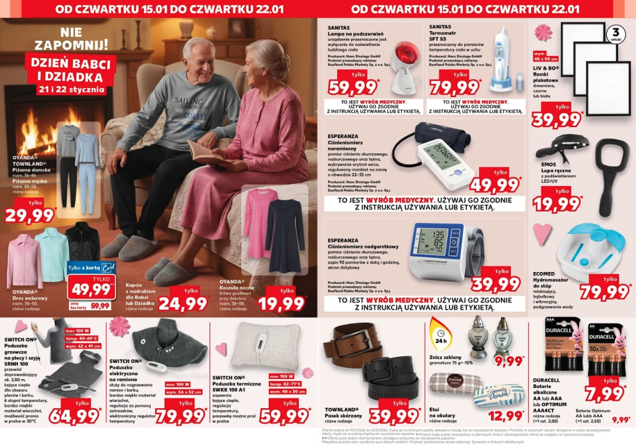 Ręcznik z haftem "Dla Babci" za 29,99 zł wygląda jak spersonalizowany prezent, choć kosztuje grosze. Piżama damska Oyanda za 29,99 zł to ciepła bawełna w rozmiarach dla starszych osób. Dziadek też nie zostanie w tyle — dres welurowy za 49,99 zł lub poduszka elektryczna na ramiona za 79,99 zł.